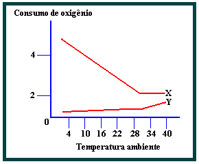 01. (FUVEST) O gráfico abaixo representa duas curvas que indicam o que acontece com o metabolismo de animais: uma para animais que mantêm constante temperatura do corpo e outra para animais cuja temperatura do corpo é igual à do ambiente.