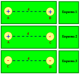 06. (UNIP) Considere os esquemas que se seguem onde A e B representam prótons e C e D representam elétrons. O meio onde estão A, B, C e D é vácuo em todos os esquemas e a distância entre as partículas em questão é sempre a mesma d