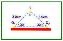 08. (MACKENZIE) Duas cargas elétricas puntiformes idênticas Q1 e Q2, cada uma com 1,0 10-7C, encontram-se fixas sobre um plano horizontal, conforme a figura abaixo.